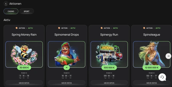 Sportspieler können ein Sport-Ersteinzahlungsangebot von 25% bis zu 100 EUR nutzen, gutgeschrieben als Gratiswette. In den verfügbaren Bedingungen ist für diese Willkommensaktionen kein Promo-Code aufgeführt.