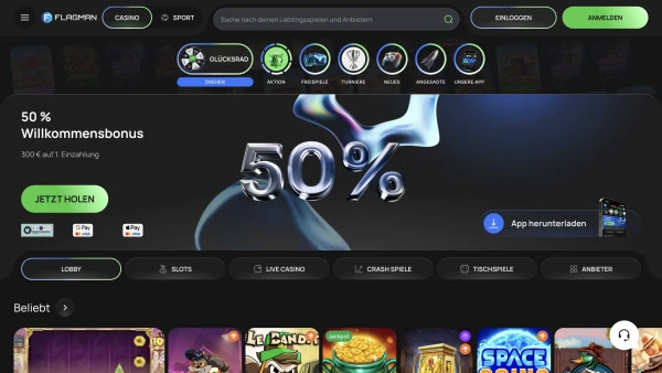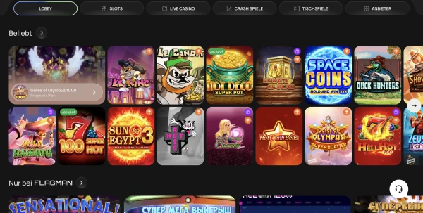 Wir arbeiten mit bekannten Anbietern wie NetEnt, Pragmatic Play, Play'n GO, Playtech, Microgaming, Yggdrasil, Betsoft, Novomatic, Big Time Gaming und Nolimit City. Diese Auswahl gibt Flagman einen ausgewogenen Katalog aus Slots, Live-Inhalten und Tischspielen.